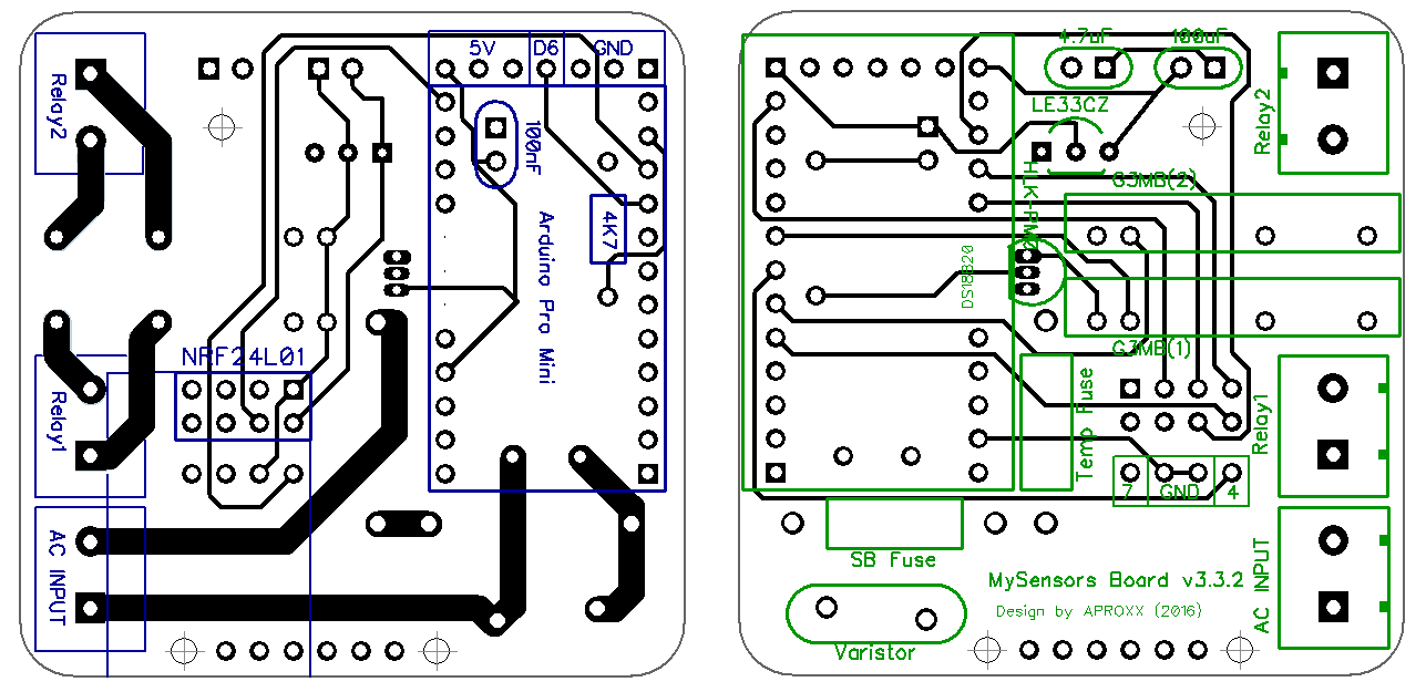 With the great help my MySensors.org , I have designed a small PCB of 50mm by 50mm. Because of this small size, it is even possible to place this custom PCB behind a light switch. The PCB is designed to fit following essential components:
